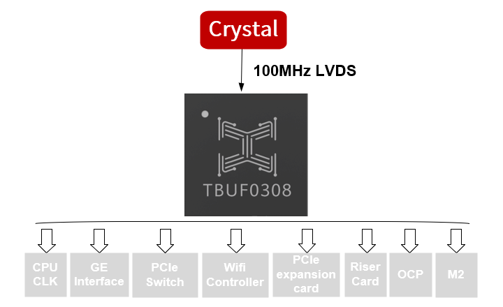 | TBUF0304 | 2.5V/3.3V | crystal/single-ended/differential | LVPECL、LVDS、HCSL | 1.5GHz | <30fs | 4 | -40℃~85℃ | QFN32 |